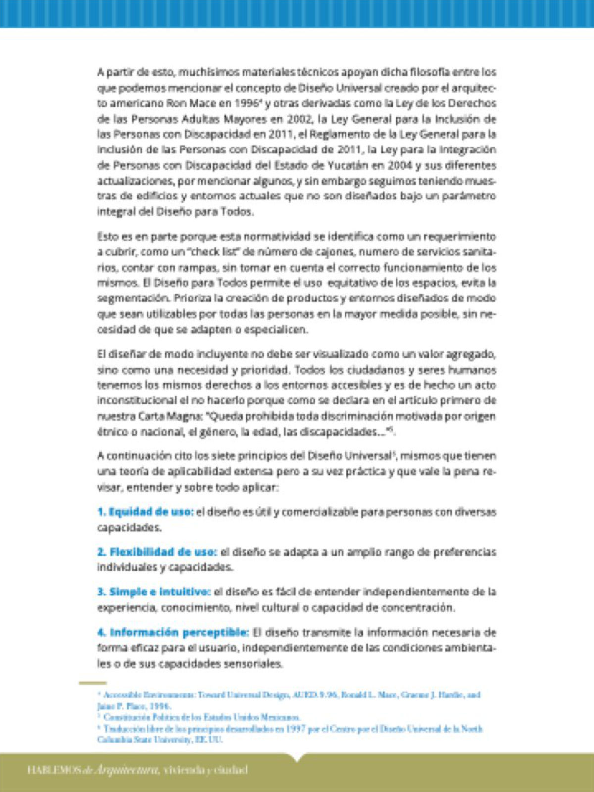 A continuación cito los siete principios del Diseño Universal6, mismos que tienen una teoría de aplicabilidad extensa pero a su vez práctica y que vale la pena re- visar, entender y sobre todo aplicar: