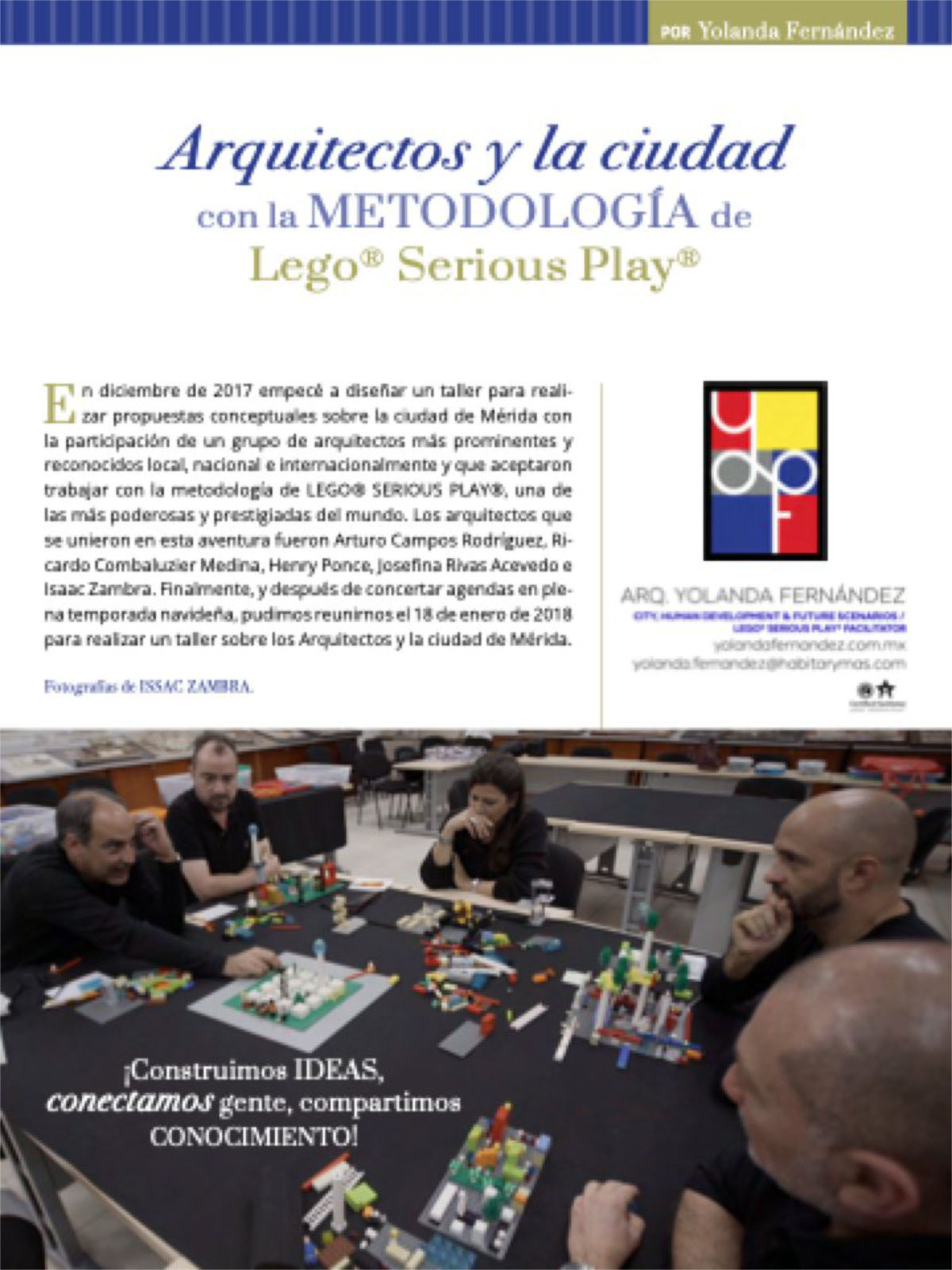 reconocidos local, nacional e internacionalmente y que aceptaron trabajar con la metodología de LEGO® SERIOUS PLAY®, una de las más poderosas y prestigiadas del mundo. Los arquitectos que se unieron en esta aventura fueron Arturo Campos Rodríguez, Ri- cardo Combaluzier Medina, Henry Ponce, Josefina Rivas Acevedo e Isaac Zambra. Finalmente, y después de concertar agendas en ple- na temporada navideña, pudimos reunirnos el 18 de enero de 2018 para realizar un taller sobre los Arquitectos y la ciudad de Mérida.