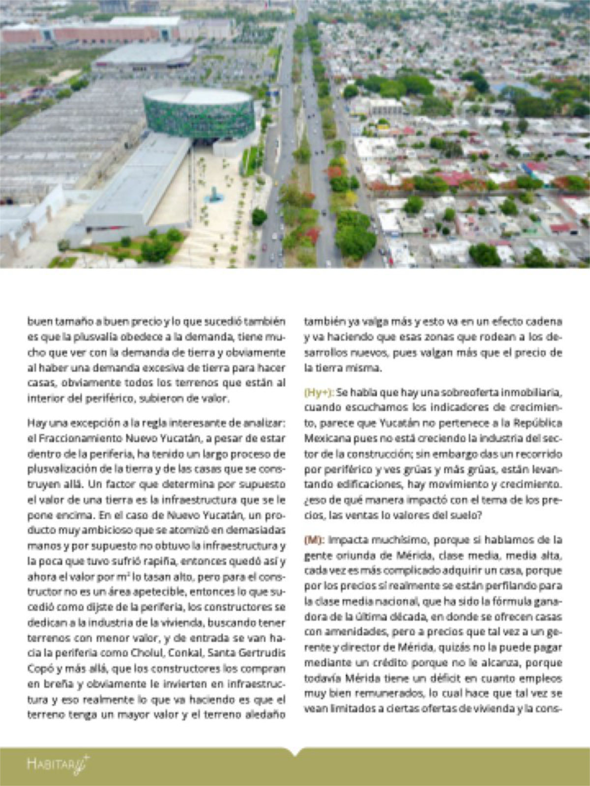 (Hy+): Se habla que hay una sobreoferta inmobiliaria, cuando escuchamos los indicadores de crecimien- to, parece que Yucatán no pertenece a la República Mexicana pues no está creciendo la industria del sec- tor de la construcción; sin embargo das un recorrido por periférico y ves grúas y más grúas, están levan- tando edificaciones, hay movimiento y crecimiento. ¿eso de qué manera impactó con el tema de los pre- cios, las ventas lo valores del suelo?