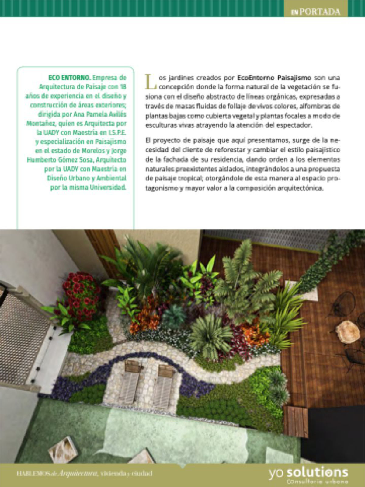 ECO ENTORNO. Empresa de Arquitectura de Paisaje con 18 años de experiencia en el diseño y construcción de áreas exteriores; dirigida por Ana Pamela Avilés Montañez, quien es Arquitecta por la UADY con Maestría en I.S.P.E. y especialización en Paisajismo en el estado de Morelos y Jorge Humberto Gómez Sosa, Arquitecto por la UADY con Maestría en Diseño Urbano y Ambiental por la misma Universidad.