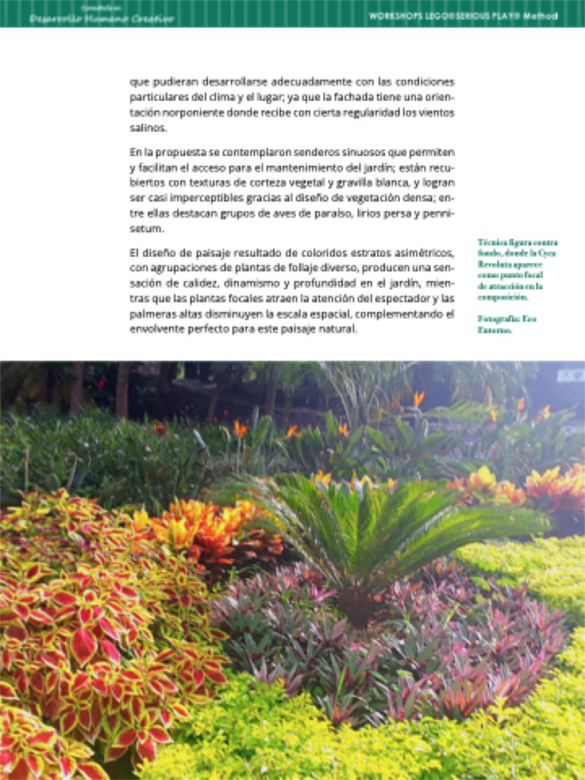 El diseño de paisaje resultado de coloridos estratos asimétricos, con agrupaciones de plantas de follaje diverso, producen una sen- sación de calidez, dinamismo y profundidad en el jardín, mien- tras que las plantas focales atraen la atención del espectador y las palmeras altas disminuyen la escala espacial, complementando el envolvente perfecto para este paisaje natural.