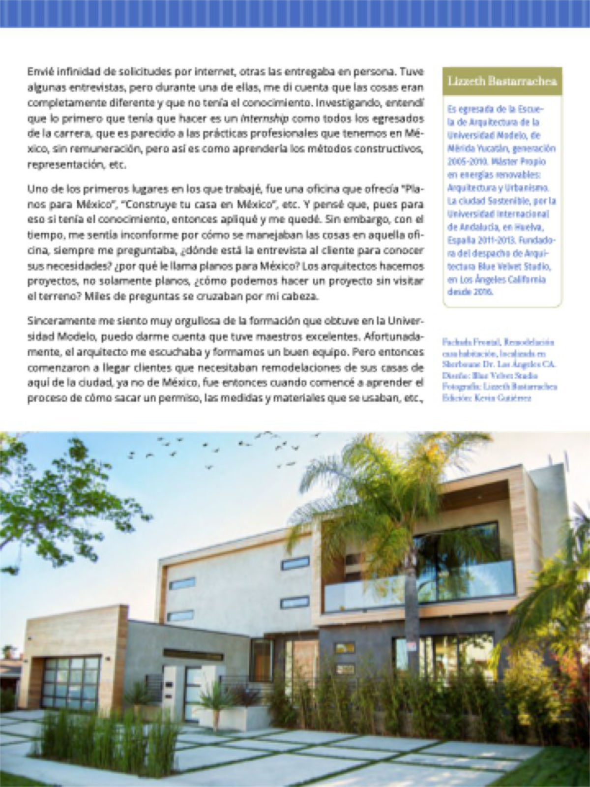 Sinceramente me siento muy orgullosa de la formación que obtuve en la Univer- sidad Modelo, puedo darme cuenta que tuve maestros excelentes. Afortunada- mente, el arquitecto me escuchaba y formamos un buen equipo. Pero entonces comenzaron a llegar clientes que necesitaban remodelaciones de sus casas de aquí de la ciudad, ya no de México, fue entonces cuando comencé a aprender el proceso de cómo sacar un permiso, las medidas y materiales que se usaban, etc.,