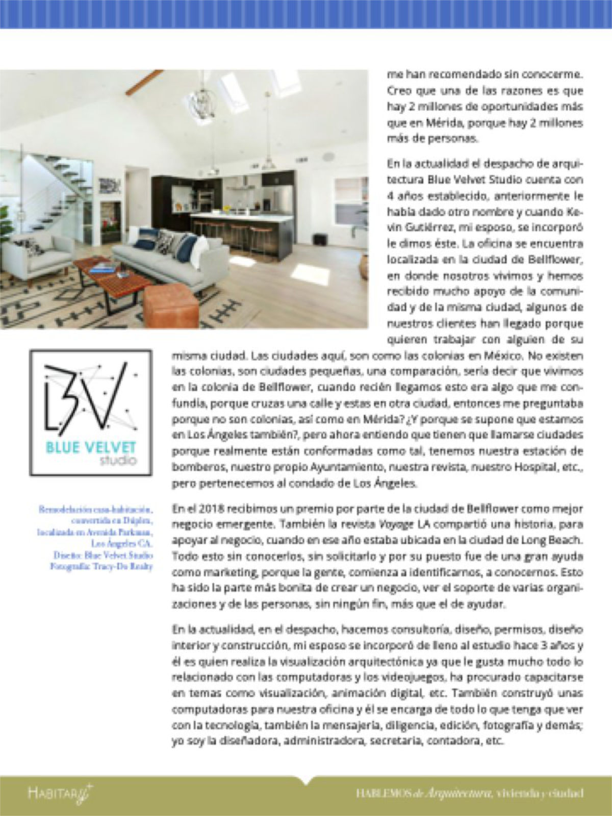 En la actualidad el despacho de arqui- tectura Blue Velvet Studio cuenta con 4 años establecido, anteriormente le había dado otro nombre y cuando Ke- vin Gutiérrez, mi esposo, se incorporó le dimos éste. La oficina se encuentra localizada en la ciudad de Bellflower, en donde nosotros vivimos y hemos recibido mucho apoyo de la comuni- dad y de la misma ciudad, algunos de nuestros clientes han llegado porque quieren trabajar con alguien de su