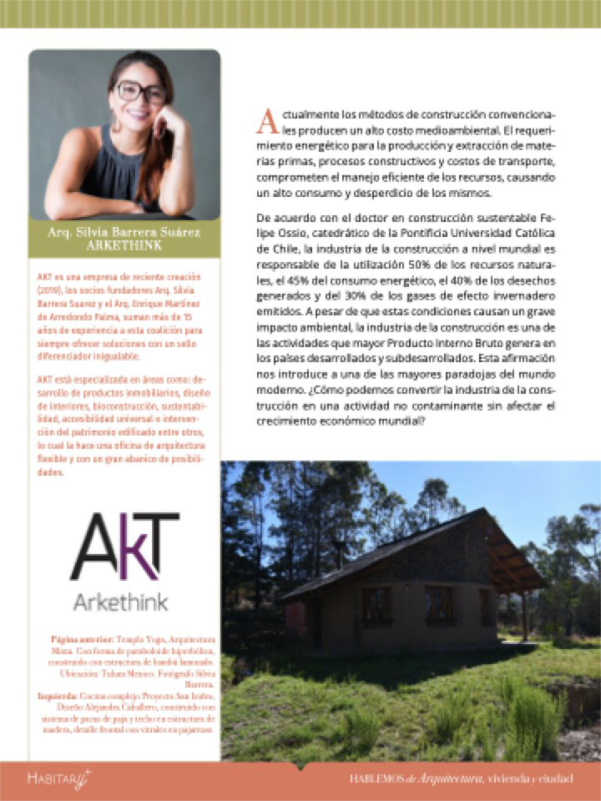 AKT está especializada en áreas como: de- sarrollo de productos inmobiliarios, diseño de interiores, bioconstrucción, sustentabi- lidad, accesibilidad universal e interven- ción del patrimonio edificado entre otros, lo cual la hace una oficina de arquitectura flexible y con un gran abanico de posibili- dades.
