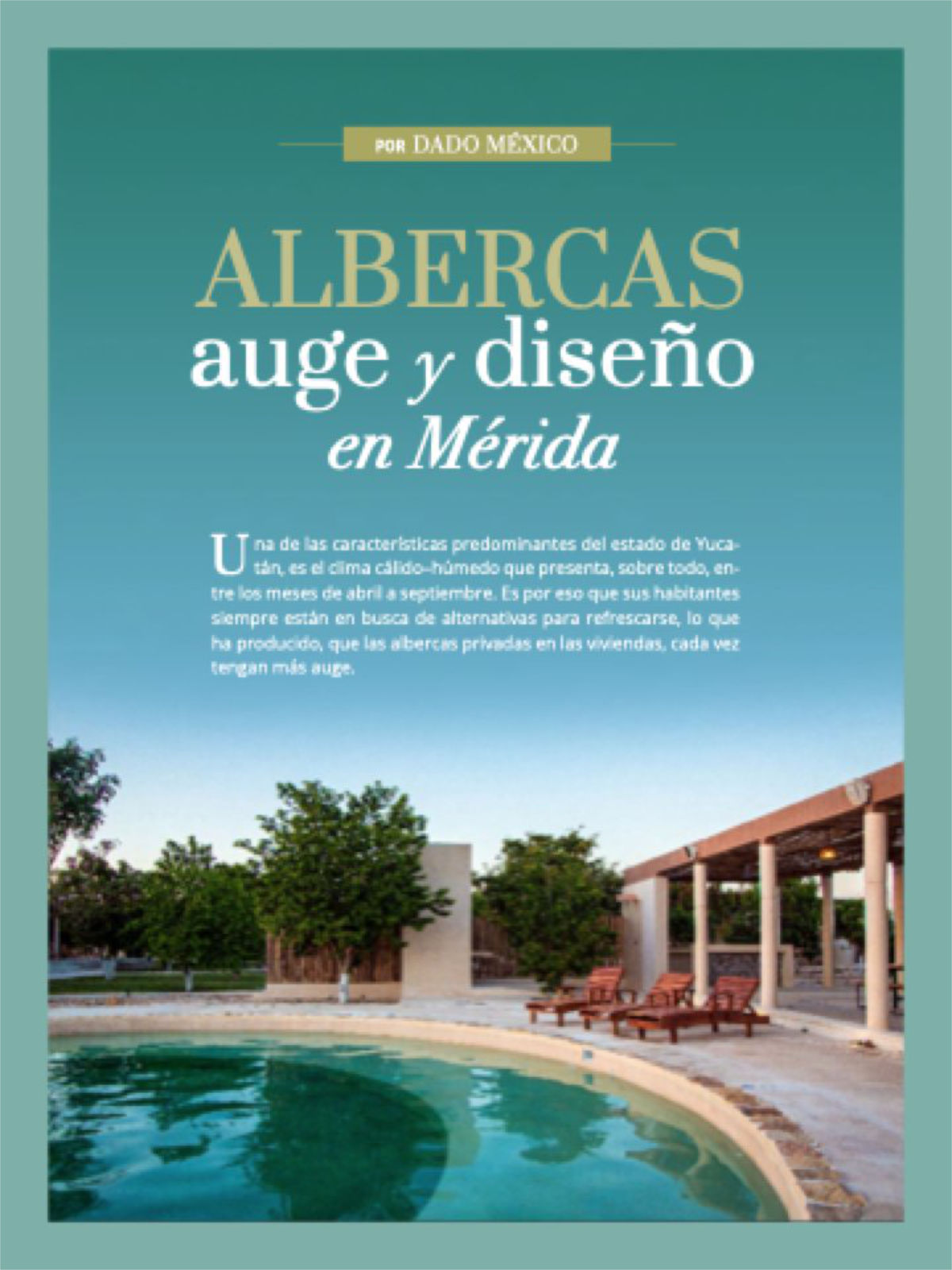 Una de las características predominantes del estado de Yucatán, es el clima cálido–húmedo que presenta, sobre todo, entre los meses de abril a septiembre. Es por eso que sus habitantes siempre están en busca de alternativas para refrescarse, lo que ha producido, que las albercas privadas en las viviendas, cada vez tengan más auge.