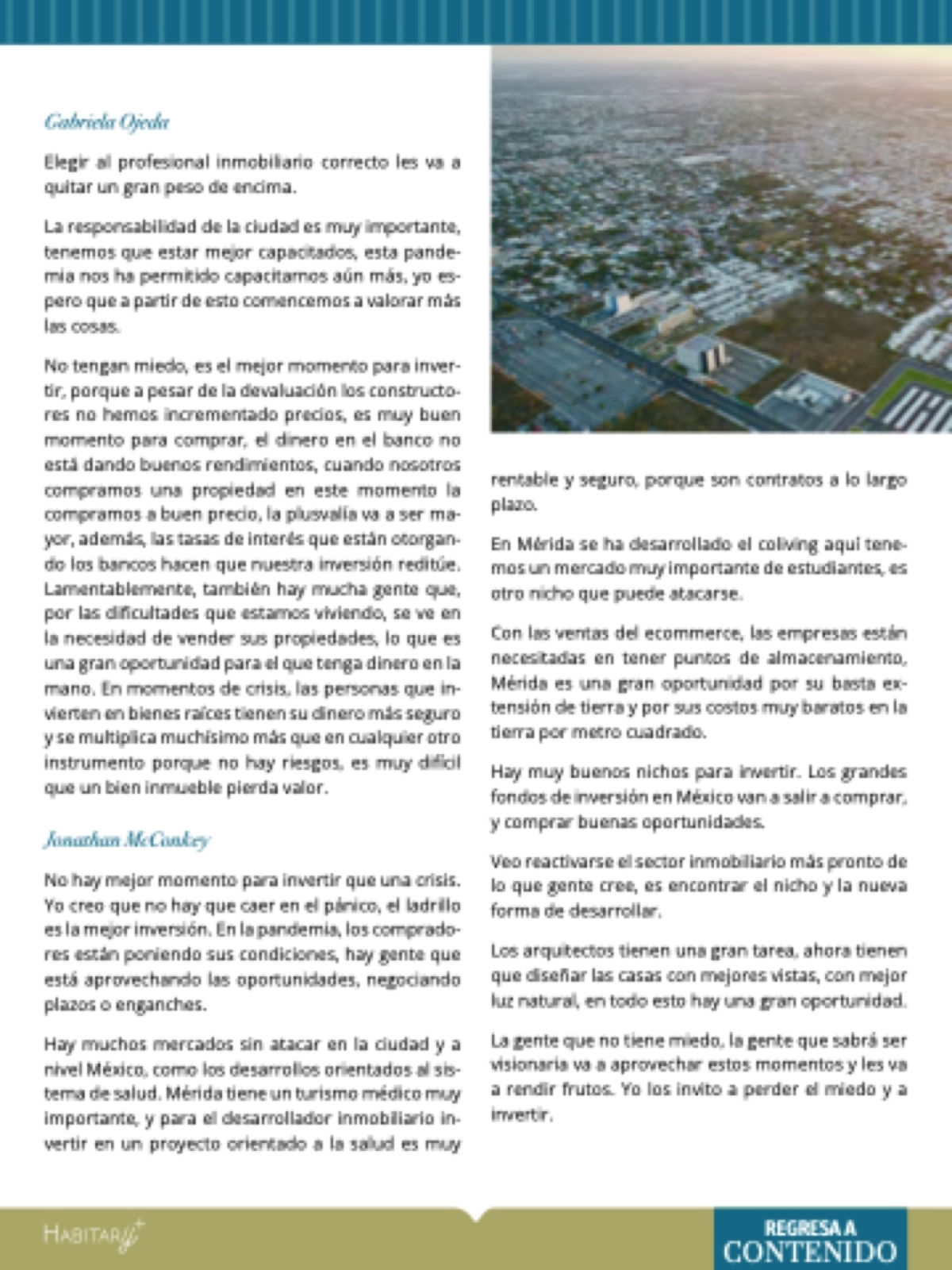 No tengan miedo, es el mejor momento para inver- tir, porque a pesar de la devaluación los constructo- res no hemos incrementado precios, es muy buen momento para comprar, el dinero en el banco no está dando buenos rendimientos, cuando nosotros compramos una propiedad en este momento la compramos a buen precio, la plusvalía va a ser ma- yor, además, las tasas de interés que están otorgan- do los bancos hacen que nuestra inversión reditúe. Lamentablemente, también hay mucha gente que, por las dificultades que estamos viviendo, se ve en la necesidad de vender sus propiedades, lo que es una gran oportunidad para el que tenga dinero en la mano. En momentos de crisis, las personas que in- vierten en bienes raíces tienen su dinero más seguro y se multiplica muchísimo más que en cualquier otro instrumento porque no hay riesgos, es muy difícil que un bien inmueble pierda valor.