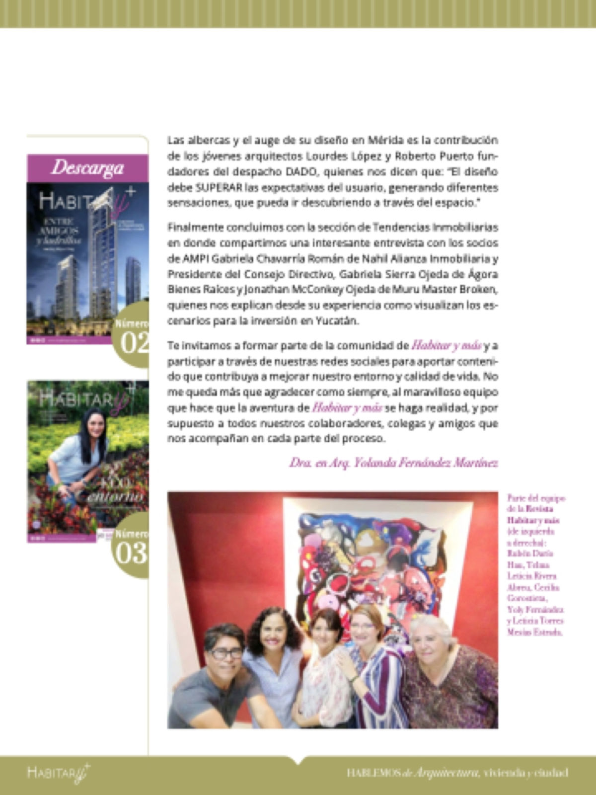 Te invitamos a formar parte de la comunidad de Habitar y más y a participar a través de nuestras redes sociales para aportar conteni- do que contribuya a mejorar nuestro entorno y calidad de vida. No me queda más que agradecer como siempre, al maravilloso equipo que hace que la aventura de Habitar y más se haga realidad, y por supuesto a todos nuestros colaboradores, colegas y amigos que nos acompañan en cada parte del proceso.