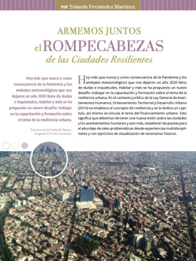 desafío: trabajar en la capacitación y formación sobre el tema de la resiliencia urbana. En el contexto jurídico de la Ley General de Asen- tamientos Humanos, Ordenamiento Territorial y Desarrollo Urbano (2016) se establece el concepto de resiliencia y se le dedica un capí- tulo, así mismo se vincula al tema del financiamiento urbano. Esto significa que debemos de tener una nueva visión sobre las ciudades y los asentamientos humanos y aún más, establecer las pautas para el abordaje de tales problemáticas desde experiencias multidiscipli- nares y con ejercicios de visualización de escenarios futuros.