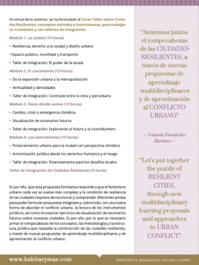 En virtud de lo anterior, se ha formulado el Curso Taller sobre Ciuda- des Resilientes: conceptos métodos e instrumentos, para trabajar en 4 módulos y con talleres de integración.